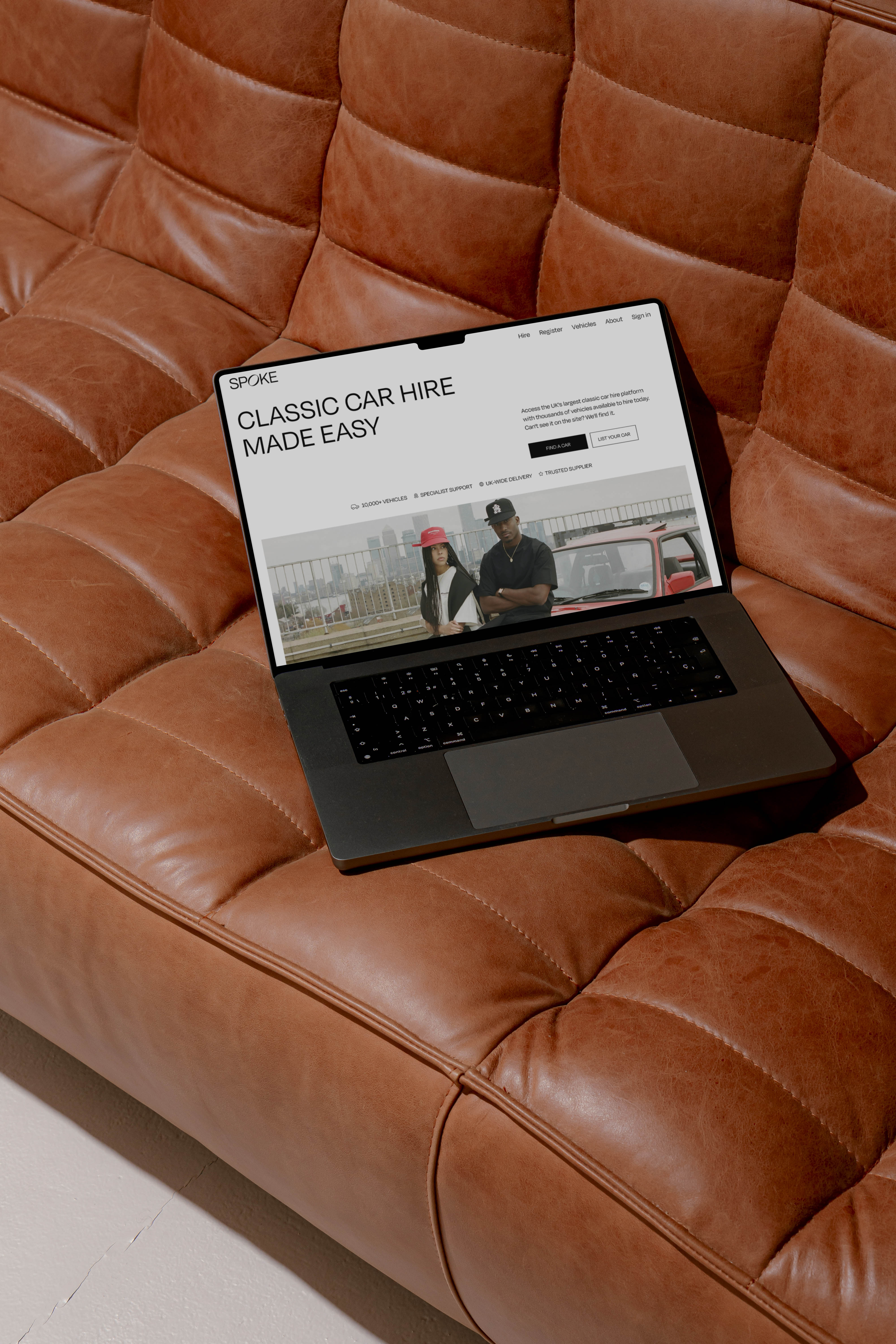 Website and webapp design for Spoke Hire, a classic car hire platform. Translating an early-stage brand identity into a contemporary, premium digital experience.